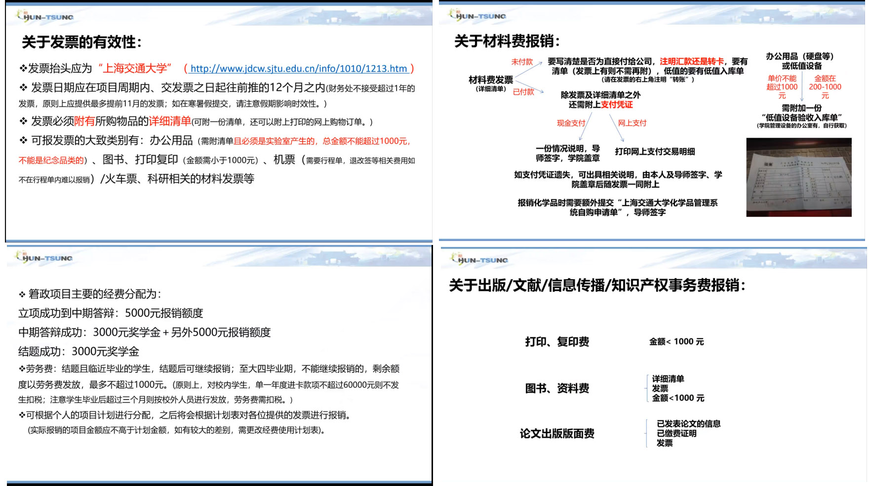 林鼎同学首先详细解释了䇹政项目的主要经费分配及发放条件,接着具体讲解了报销材料的要求,强调了报销材料自查表以及䇹政提供清单,最后说明了报销材料的上交流程,并给出了具体示例便于同学们理解。在讲解完毕后对于同学们的疑惑进行了解答。