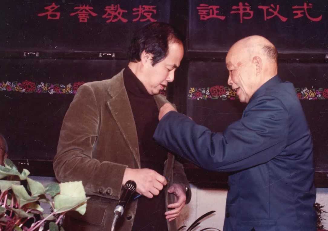 1982年,苏步青为李政道佩戴复旦大学校徽
