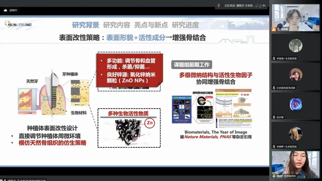 来自医学院的的潘黎莎同学为我们展示了她的课题——《钛复合纳米氧化锌多级微纳结构修饰碳纤维增强聚醚醚酮植体促2型糖尿病大鼠骨结合的研究》。她针对2型糖尿病患者缺少有效商用种植体的问题,分别从骨结合和抗菌功能两方面提出了解决方案。