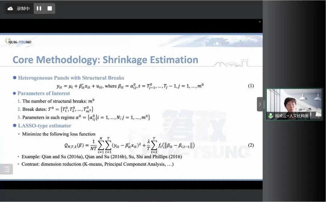 来自安泰经济与管理学院的周凌云同学为我们展示了他的课题——《具有共同结构断点和异质效应的面板数据模型》。他主要向大家介绍了对具有共同结构断点和异质效应的面板数据模型的参数估计方法。