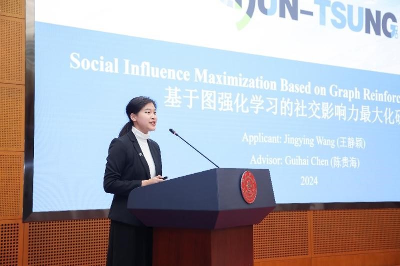 第十一期䇹政立项学生、来自电子信息与电气工程学院的王静颖在前期分会议中脱颖而出,作为学生代表分享她的学术研究。她介绍了《基于图强化学习的社交影响力最大化研究》的背景和意义,强调了在社交媒体盛行的今天,研究信息流动的重要性,并探讨了如何通过强化学习优化社交网络中的影响力传播。通过实验,王静颖同学验证了图神经网络(GNN)模型在传播范围估算中的优势,并通过引入联合推理模块,有效减轻了传播过程中的偏离问题。她的研究不仅为社交网络中的信息传播机制提供了新的视角,也为图上的组合优化问题提供了有价值的参考。