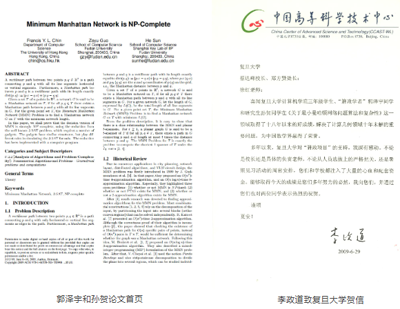 复旦大学2006级计算机系的䇹政学者郭泽宇,在项目研修期间解决了计算几何领域的一个世纪难题“最小曼哈顿网络问题”,2009年,其论文被美国ACM学会主办的第25届计算几何国际会议录用,文章同时作为最佳论文之一被邀请投稿到会议特刊(DCG)。这一曾经困扰科学界十余年的难题,最终被年仅20岁的复旦䇹政学者解决。特别值得一提的是,指导郭泽宇攻克这一难题的,是同样年轻的复旦大学在读博士孙贺。