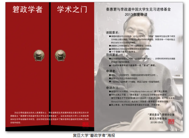 复旦在实施“䇹政学者”项目中,始终贯彻李先生的初衷,明确工作思路,从培养学生自主意识和能力的目标出发,积极探索管理方式,构建了一套开放的、规范的、完整的办法。建立了网上管理平台,把项目的各方面信息,都向学生公布,让学生自行查阅办理。