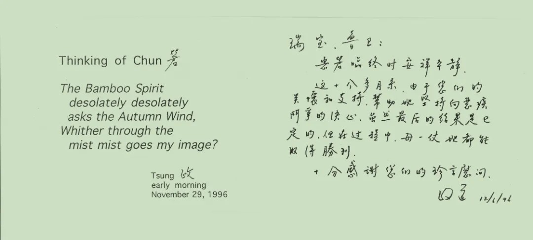 李政道给陶瑞宝、周鲁卫的回信,信笺左侧为《念䇹》诗英译版