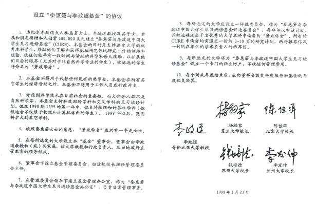 李政道和四所大学签订的设立“秦惠䇹与李政道基金”的协议书