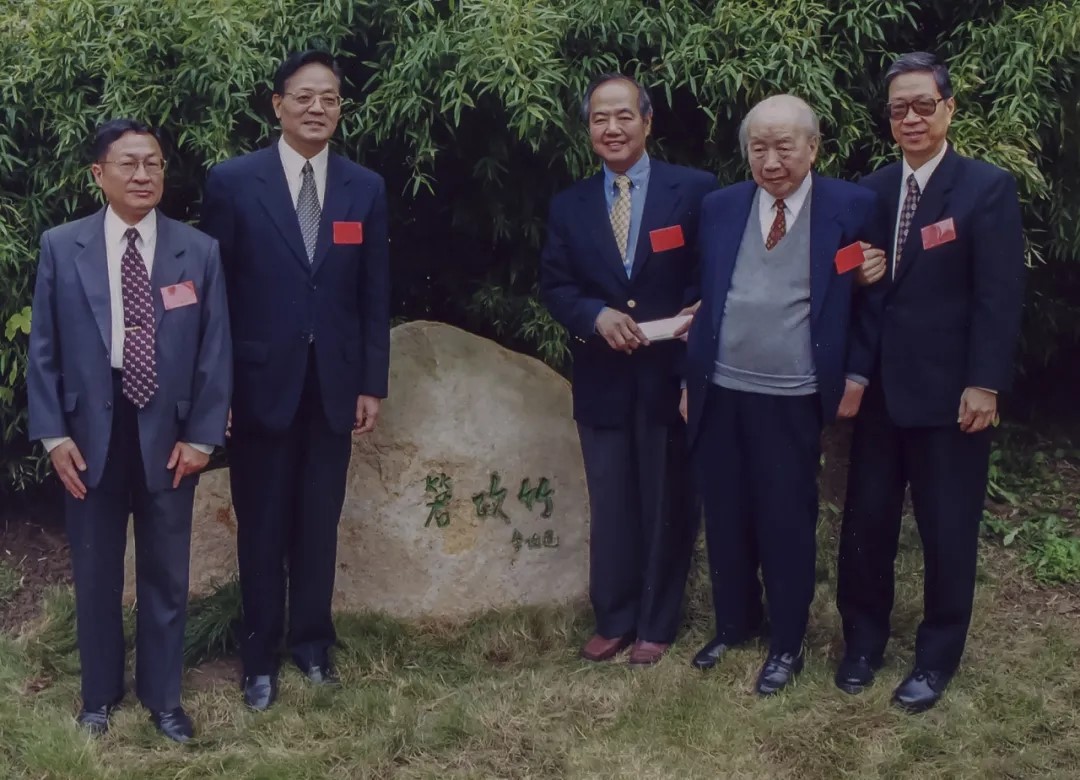 2000年10月,李政道与孙莱祥(左一)、王生洪(左二)、钱伟长(右二)、杨福家(右一)为“䇹政竹”纪念石揭牌